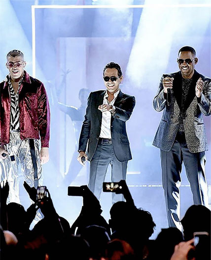 Bad Bunny in Triple RRR zebra shirt performing at Grammys awards